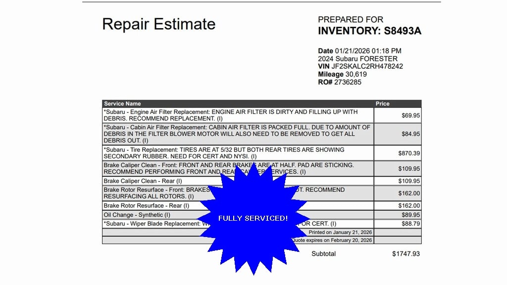 Royal Nissan Subaru is proud to offer this terrific 2024 Subaru Forester a truly superb SUV with the following Features: Nav & harman/kardon & RAB & Heated Steering Wheel (harman/kardon 9-Speaker Audio System, Heated Steering Wheel, Radio: Subaru STARLINK 8.0" Multimedia Nav System, and Reverse Automatic Braking System (RAB)), 3.70 Axle Ratio, 4-Wheel Disc Brakes, 6 Speakers, ABS brakes, Air Conditioning, All-Weather Floor Liners, Alloy wheels, AM/FM radio: SiriusXM, Anti-whiplash front head restraints, Auto High-beam Headlights, Auto-Dimming Mirror w/Compass & HomeLink, Automatic temperature control, Brake assist, Bumpers: body-color, Cargo Net, Driver door bin, Driver vanity mirror, Dual front impact airbags, Dual front side impact airbags, Electronic Stability Control, Emergency communication system: STARLINK Safety and Security (Subscription Required), Exterior Parking Camera Rear, Four wheel independent suspension, Front anti-roll bar, Front Bucket Seats, Front Center Armrest, Front dual zone A/C, Front fog lights, Front reading lights, Fully automatic headlights, Heated door mirrors, Heated Front Bucket Seats, Heated front seats, Illuminated entry, Knee airbag, Leather Shift Knob, Leather steering wheel, LED Upgrade, Low tire pressure warning, Navigation System, Occupant sensing airbag, Outside temperature display, Overhead airbag, Overhead console, Panic alarm, Passenger door bin, Passenger vanity mirror, Perforated Leather-Trimmed Upholstery, Power door mirrors, Power driver seat, Power Liftgate, Power moonroof: Panoramic, Power steering, Power windows, Radio data system, Radio: Subaru STARLINK 8.0" Multimedia Plus System, Rear anti-roll bar, Rear Bumper Cover, Rear seat center armrest, Rear Seatback Protector, Rear window defroster, Rear window wiper, Remote keyless entry, Roof rack: rails only, Security system, Speed control, Speed-sensing steering, Splash Guards, Split folding rear seat, Spoiler, STARLINK/Apple CarPlay/Android Auto, Steering wheel mounted audio controls, Tachometer, Telescoping steering wheel, Tilt steering wheel, Traction control, Trip computer, Turn signal indicator mirrors, Variably intermittent wipers, and Wheels: 18" x 7.0 J Black Machine Finish Alloy.