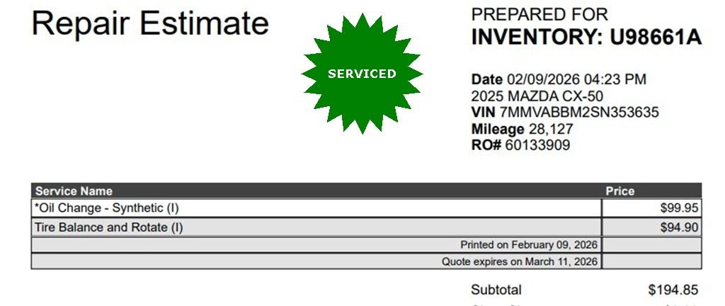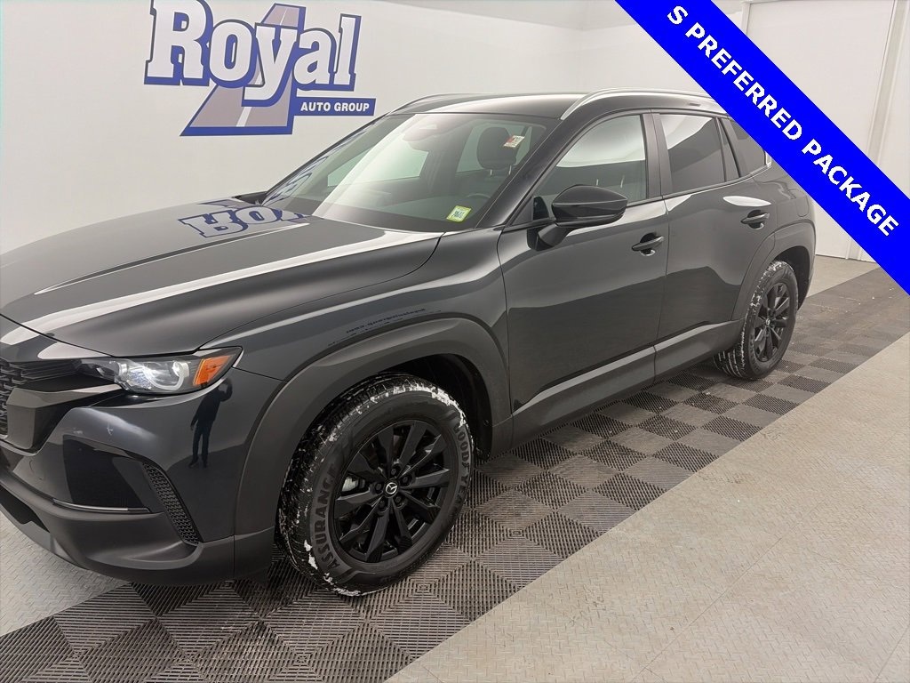 2025 Mazda CX-50 2.5 S Preferred Package AWD Jet Black Mica 6-Speed Automatic SKYACTIV® 2.5L 4-Cylinder DOHC 16VRecent Arrival! 25/31 City/Highway MPGRoyal Motor Company is proud to offer this superb 2025 Mazda CX-50 a truly fantastic-looking SUV with the following Features: 4-Wheel Disc Brakes, 8 Speakers, ABS brakes, Air Conditioning, Alloy wheels, AM/FM radio, AppLink/Apple CarPlay and Android Auto, Auto High-beam Headlights, Automatic temperature control, Black Lug Nuts and Black Wheel Locks, Brake assist, Bumpers: body-color, Carpet Cargo Mat, Delay-off headlights, Driver door bin, Driver vanity mirror, Dual front impact airbags, Dual front side impact airbags, Electronic Stability Control, Emergency communication system: MAZDA CONNECT, Exterior Parking Camera Rear, Front anti-roll bar, Front Bucket Seats, Front Center Armrest, Front dual zone A/C, Front reading lights, Front wheel independent suspension, Fully automatic headlights, Half Leatherette Seat Trim, Heated door mirrors, Heated Front Bucket Seats, Heated front seats, Illuminated entry, Knee airbag, Leather Shift Knob, Leather steering wheel, Low tire pressure warning, Occupant sensing airbag, Outside temperature display, Overhead airbag, Overhead console, Panic alarm, Passenger door bin, Passenger vanity mirror, Power door mirrors, Power driver seat, Power Liftgate, Power steering, Power windows, Radio data system, Radio: AM/FM/HD 8-Speaker Audio Sound System, Rain sensing wipers, Rear seat center armrest, Rear window defroster, Rear window wiper, Remote keyless entry, Speed control, Speed-sensing steering, Split folding rear seat, Spoiler, Steering wheel mounted audio controls, Tachometer, Telescoping steering wheel, Tilt steering wheel, Traction control, Trip computer, Turn signal indicator mirrors, Variably intermittent wipers, and Wheels: 17 x 7J Aluminum Alloy Black Metallic Finish.