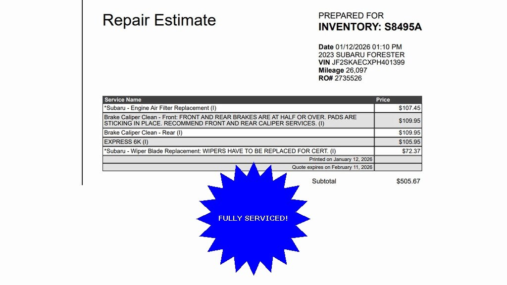 Royal Nissan Subaru is proud to offer this outstanding-looking 2023 Subaru Forester an absolutely good-looking SUV with the following Features: Blind Spot Detection w/RCTA & Power Rear Gate (Blind-Spot Detection (BSD), Driver's Seatback Divided Pocket, Dual USB Charge Ports, EyeSight System, Multi-Function High Grade Display, and Power Rear Gate), 3.70 Axle Ratio, 4-Wheel Disc Brakes, 6 Speakers, ABS brakes, Air Conditioning, Alloy wheels, AM/FM radio: SiriusXM, Anti-whiplash front head restraints, Auto High-beam Headlights, Automatic temperature control, Brake assist, Bumpers: body-color, CD player, Driver door bin, Driver vanity mirror, Dual front impact airbags, Dual front side impact airbags, Electronic Stability Control, Emergency communication system: STARLINK Safety and Security (Subscription Required), Exterior Parking Camera Rear, Four wheel independent suspension, Front anti-roll bar, Front Bucket Seats, Front Center Armrest, Front fog lights, Front reading lights, Fully automatic headlights, Heated door mirrors, Heated Front Bucket Seats, Heated front seats, Illuminated entry, Knee airbag, Low tire pressure warning, Occupant sensing airbag, Outside temperature display, Overhead airbag, Overhead console, Panic alarm, Passenger door bin, Passenger vanity mirror, Power door mirrors, Power driver seat, Power moonroof: Panoramic, Power steering, Power windows, Premium Cloth Upholstery, Radio data system, Radio: Subaru Starlink 6.5" Multimedia Plus System, Rear anti-roll bar, Rear seat center armrest, Rear window defroster, Rear window wiper, Remote keyless entry, Roof rack: rails only, Security system, Speed control, Speed-sensing steering, Split folding rear seat, Spoiler, STARLINK/Apple CarPlay/Android Auto, Steering wheel mounted audio controls, Tachometer, Telescoping steering wheel, Tilt steering wheel, Traction control, Trip computer, Variably intermittent wipers, and Wheels: 17" x 7.0 J Black Machine Finish Alloy.
