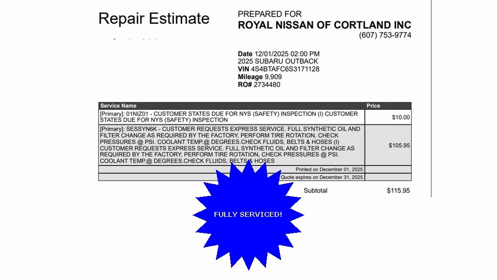 Royal Nissan Subaru is proud to offer this good-looking 2025 Subaru Outback a truly fantastic SUV with the following Features: BSD & RCTA & Keyless Access & Push Button Start (Blind Spot Detection (BSD), Hands-Free Power Rear Gate, Keyless Access w/Push Button Start, Power Moonroof, Radio: Subaru 11.6" Multimedia System w/Navigation, and Rear Cross Traffic Alert (RCTA)), 4-Wheel Disc Brakes, 6 Speakers, ABS brakes, Air Conditioning, Alloy wheels, AM/FM radio: SiriusXM with 360L, Apple CarPlay & Android Auto, Auto High-beam Headlights, Automatic temperature control, Brake assist, Bumpers: body-color, Cloth Upholstery, Driver door bin, Driver vanity mirror, Dual front impact airbags, Dual front side impact airbags, Electronic Stability Control, Emergency communication system: MySubaru Safety (3-year free trial), Exterior Parking Camera Rear, Four wheel independent suspension, Front anti-roll bar, Front Bucket Seats, Front Center Armrest w/Storage, Front dual zone A/C, Front fog lights, Front reading lights, Fully automatic headlights, Heated door mirrors, Heated Front Bucket Seats, Heated front seats, Illuminated entry, Knee airbag, Leather Shift Knob, Leather steering wheel, Low tire pressure warning, Occupant sensing airbag, Outside temperature display, Overhead airbag, Overhead console, Panic alarm, Passenger door bin, Passenger vanity mirror, Power door mirrors, Power driver seat, Power steering, Power windows, Radio: Subaru 11.6" Multimedia Plus System, Rear anti-roll bar, Rear seat center armrest, Rear window defroster, Rear window wiper, Remote keyless entry, Roof rack, Security system, Speed control, Speed-sensing steering, Split folding rear seat, Spoiler, Steering wheel mounted audio controls, Tachometer, Telescoping steering wheel, Tilt steering wheel, Traction control, Trip computer, Turn signal indicator mirrors, Variably intermittent wipers, and Wheels: 17" x 7J Black Aluminum-Alloy.